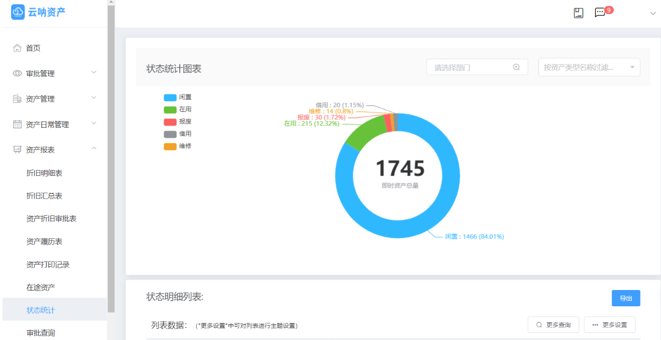 多维度报表可视化查看 采用“一物一码”的全生命周期闭环式管理固定资产,从固定资产的申购,到折旧报废,每个固定资产的详情都可以扫码调取实时信息。并可按多种查询维度生成可视化报表,便于管理员和决策者对固定资产进行统计分析,掌握所有固定资产状态。