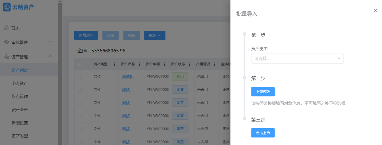 具体方案实施流程 保证资产数据准确性 云呐固定资产管理系统支持一键批量导入资产信息,PC端+APP结合使用,无需人工录入多个表格。所有操作皆可留痕。领用、退库、借用、归还,变更、报废等单据皆可随时查看,保证账实一致。