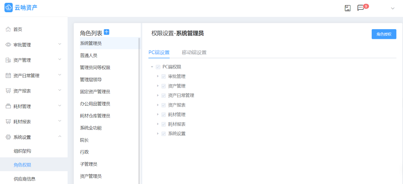 角色权限管理 给每个分公司设置角色权限和数据权限,各自负责自己分公司的固定资产录入。由集团总公司统筹管理,允许您为每一个用户分配权限,包括添加、编辑、修改、删除、审核、拒绝等权限,确保系统应用安全。