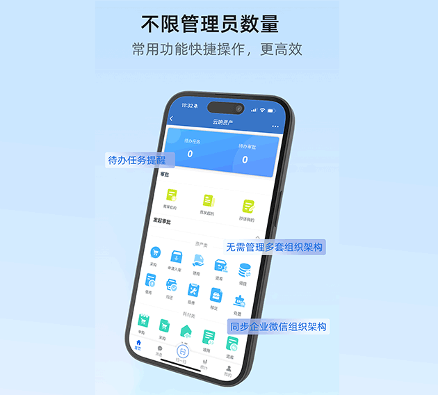 资产多级流程审批管理机制:通过云呐资产工作流程审批,在工作台待办统一入口,可直观查看企业资产待处理事项。除了应用自己配置的系统审批流程之外,还能够应用企业微信的审批流程。既统一用户体验,又提升用户办公效率。