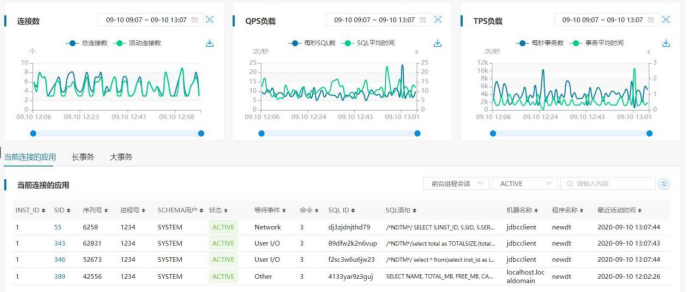 工作负载看板:提供了数据库工作负载的全面画像,用户可以值观了解到数据库的活动连接、TPS、QPS、响应时间等关键指标;通过工作负载功能, 用户还可以直接定位数据库中的长事务以及大事务。