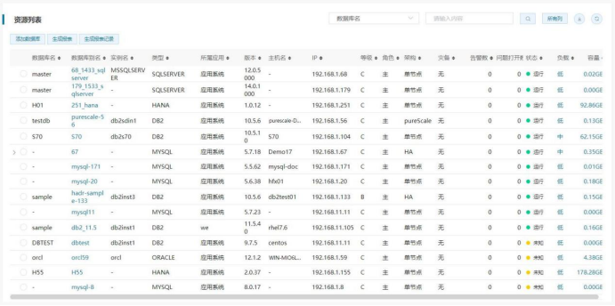 对纳管的所有数据库进行统一管理,在平台中可以看到所有被纳管数据库的基本信息、运行状态、负载以及容量使用状况。